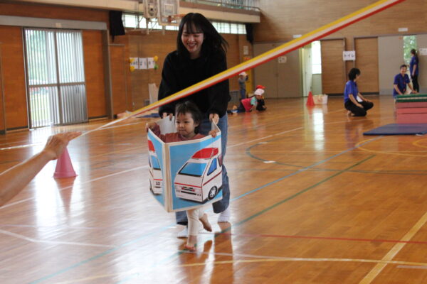 未満児さんは、お家の人と一緒にバナナたいそうを踊ったり、消防士や救命士になりきって障害物にチャレンジ!