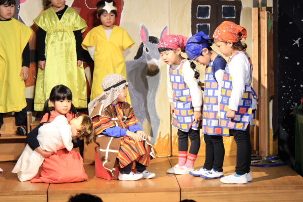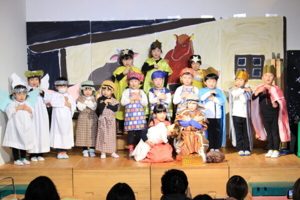12月13日にクリスマス会がありました。今年度の(幼児組)聖劇は、子どもたちの意志で”ステージでやる!”と決まり、ひかりキッズでは数年ぶりに全編をステージで発表させていただきました。クリスマスの始まりは、今から2000年以上前、イエス様が誕生された日からです。