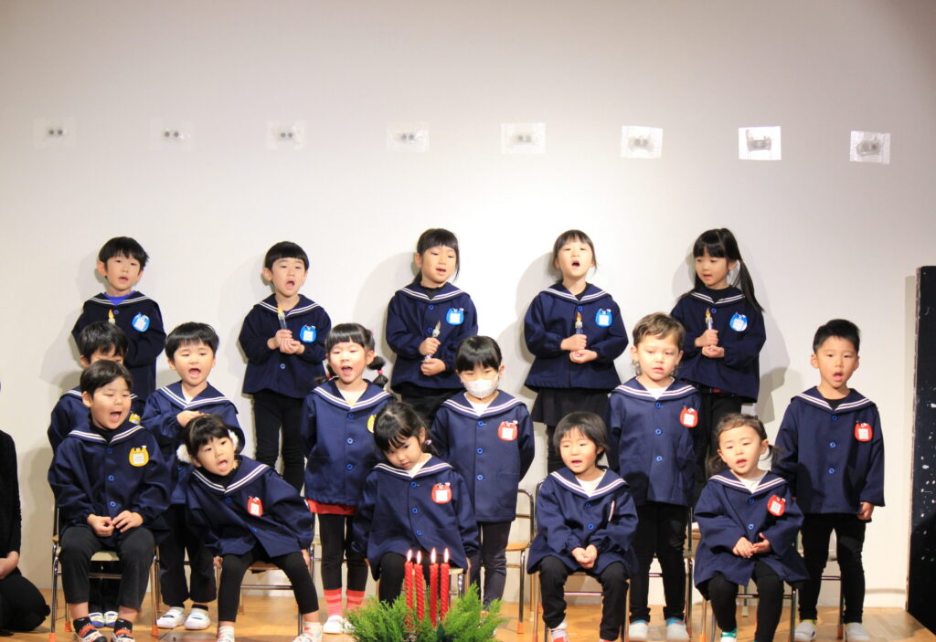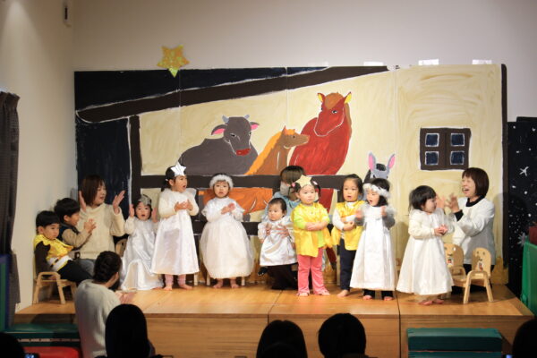 未満児組もイエス様の誕生を知らせ、導いた大星や天使、羊飼いになりきってステージに登りました!みんな緊張の中でも泣かずにやりきりました。すごい!