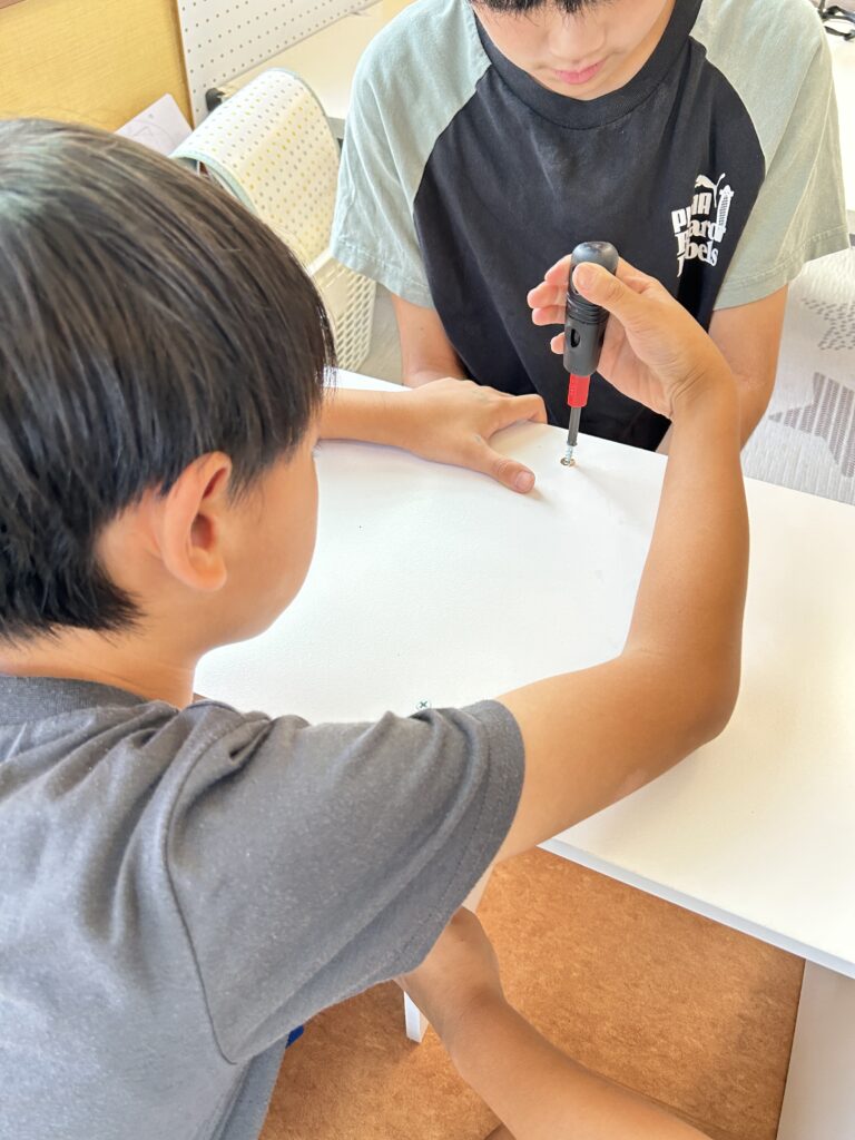 ドライバーを回す人、木を支える人、交代交代に協力をしながら作っています。